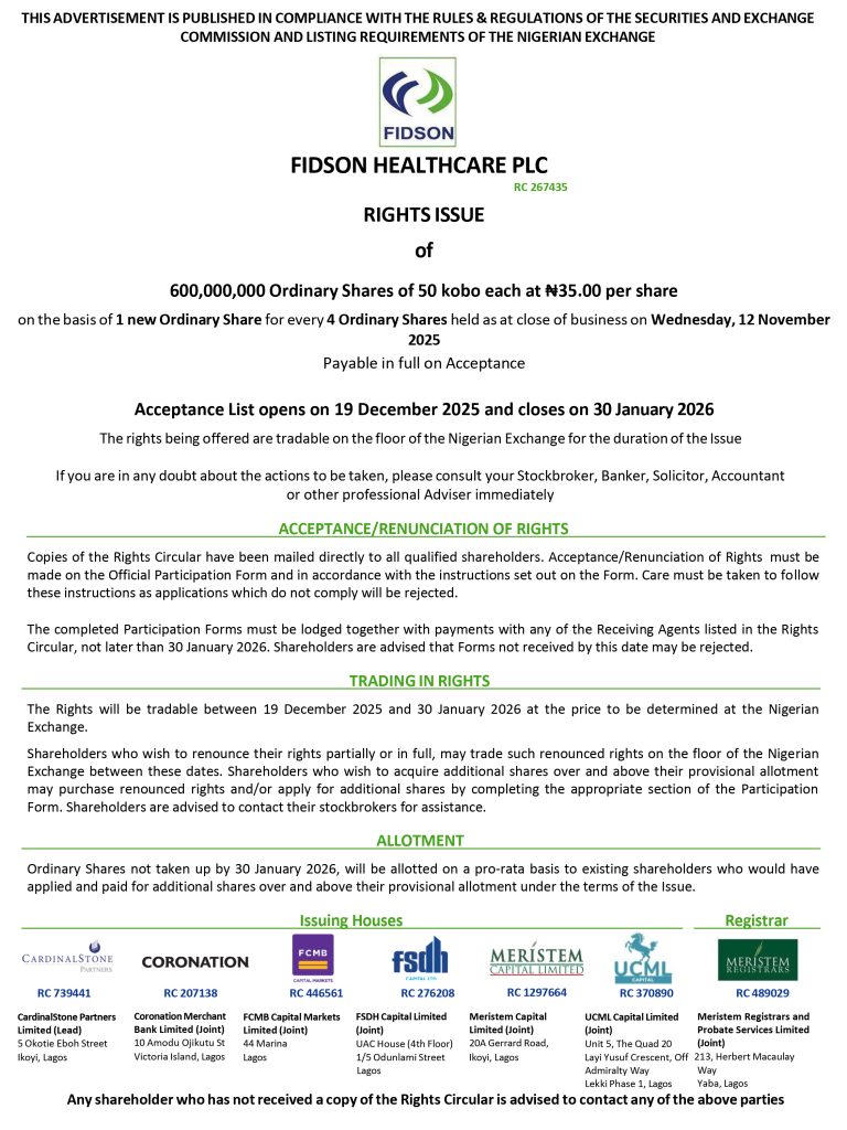 Fidson Healthcare Plc, Nigeria’s leading pharmaceutical manufacturer, is pleased to announce the formal launch of its N21 Billion Rights Issue. Following regulatory approval from the Securities and Exchange Commission (SEC) and the Nigerian Exchange Limited (NGX), this strategic capital raise is designed to consolidate our industry leadership and accelerate our growth across the continent.